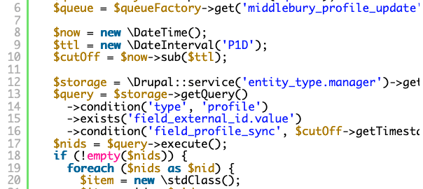 As a note, our Profile content type in Drupal contains two text fields that aren’t shown on the rendered page. The first, field_external_id, contains a 32 character hexadecimal string that is a unique, persistent identifier for the individual. Everyone at Middlebury has one of these which allows for quick records access across platforms. The second, field_profile_sync, contains a timestamp we can use to ensure we’re not hammering the remote services to fetch the same data over and over again.